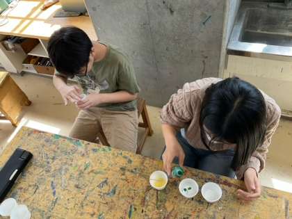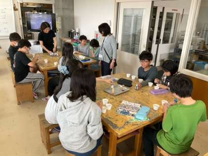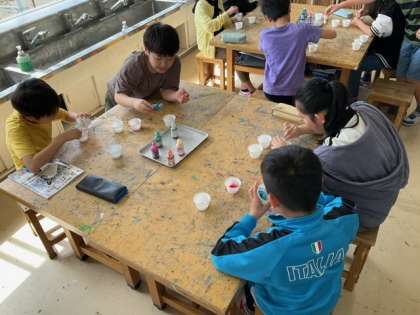 図工の時間です。白い砂に和紙染めを使って自分の色を作ります。自分だけの色の砂で絵を描くと
