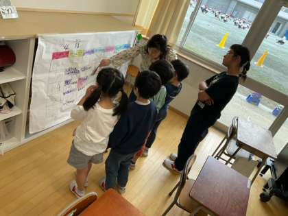 グループ学習の時間です。5年生は、時計すごろくを使って時計の学習をしています。