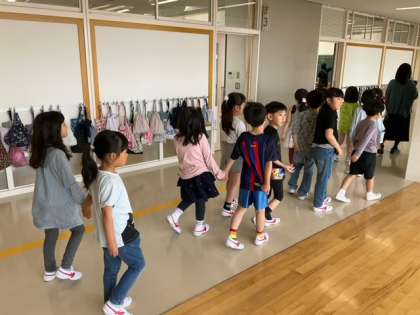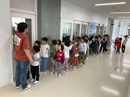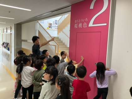 生活科の時間です。クラスごとに、学校探検をしています。少しずつ覚えていきましょう。