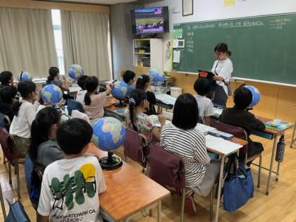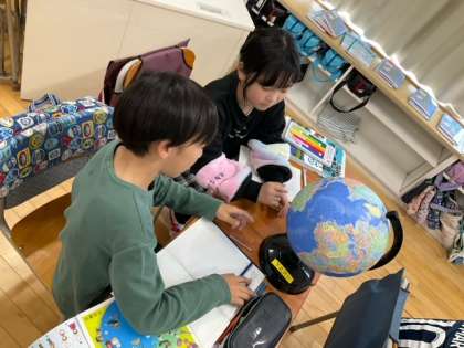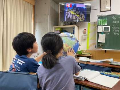 社会科の時間です。写真をヒントに、世界の国や大陸、海洋を調べています。