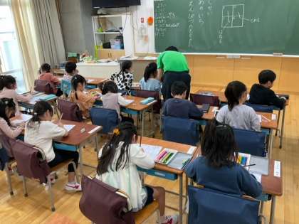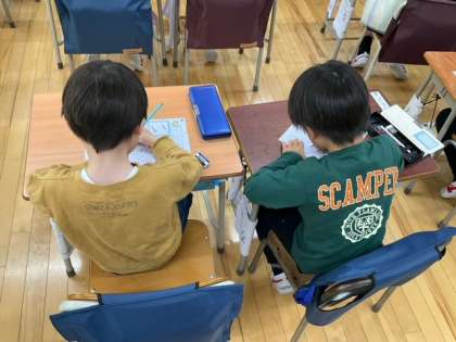 国語の時間です。姿勢、目の位置、鉛筆の持ち方に気をつけて、ひらがなの練習をしています。