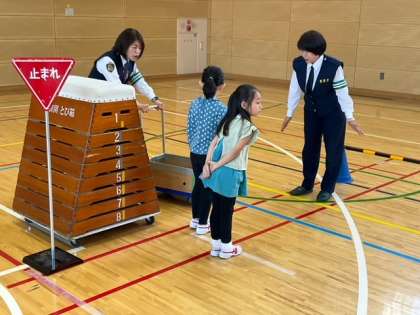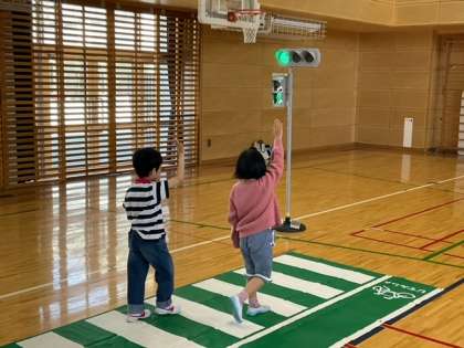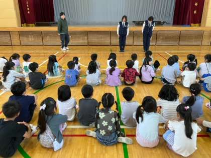 今日は、北沢警察署から講師を招いて、1年生交通安全教室を開いています。