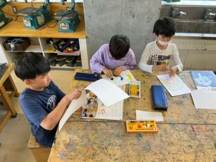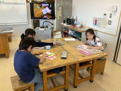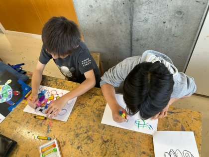 図工の時間です。クレヨン技法に挑戦中です。「二刀流」「点と線と面」「叩く」などなど