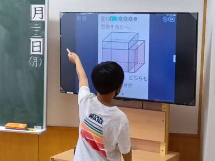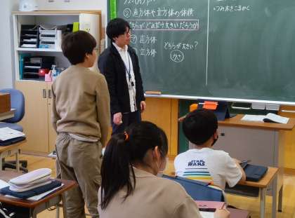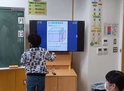算数の時間です。直方体や立方体の大きさを比べました。みんなで比べ方のアイディアを出し合いました。