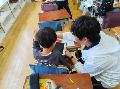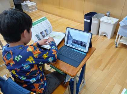 社会の時間です。学校のまわりの様子を方位ごとにまとめました。ipadでとった写真やロイロノートを上手に使っています。