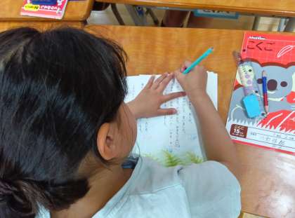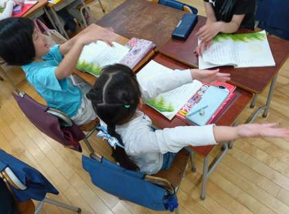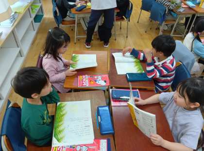 国語の時間です。ふきのとうの音読発表会に向けて、班で練習をしました。振りをつけるなど工夫している班もありました。