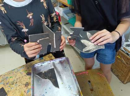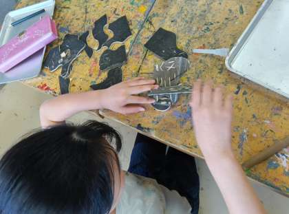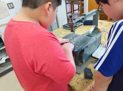 図工の時間です。電動のこぎりを使って板の形を作り、組木パズルを作りました。とても素敵な作品ができあがっています。