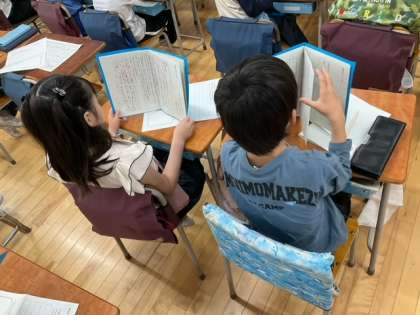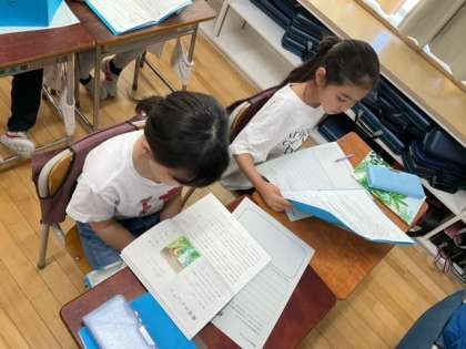 国語の時間です。「春風をたどって」物語の続きを想像して、自分の力で考えています。