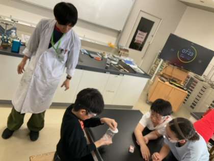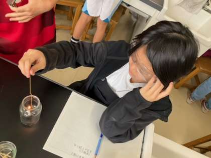 理科の時間です。ろうそくに火をつけ、ビーカーに入れて蓋をしたあと、石灰水を入れると