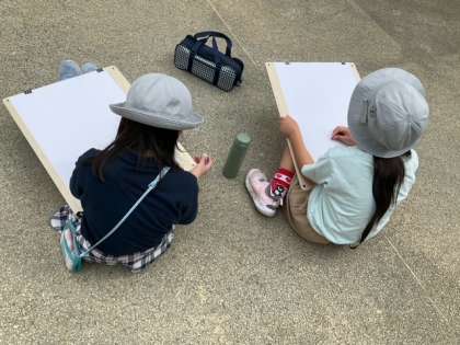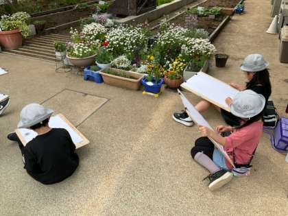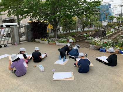 図工の時間です。校庭に出て、思い思いにスケッチをしています。おだやかな良い時間ですね。