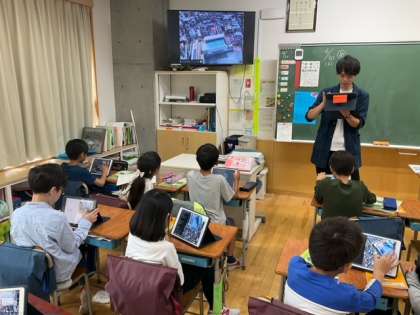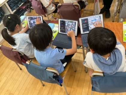 社会科の時間です。「土地の使われ方」の学習をします。屋上から学校のまわりを観察したあと、iPadで細かく調べています。