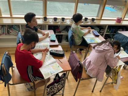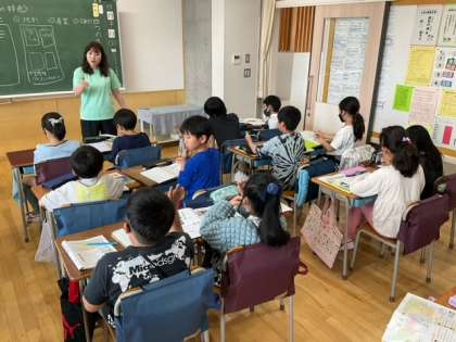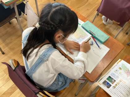 社会科の時間です。土地、地形、産業、交通網の4つの視点をもとに、東京都の特色をまとめています。