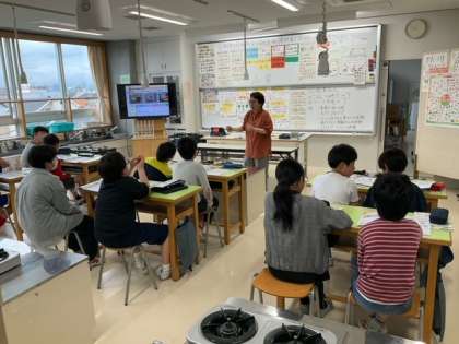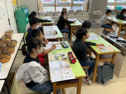 家庭科の時間です。「朝食から健康な1日の生活を」教科書の朝食の写真を見て、よい点と課題点を考えています。