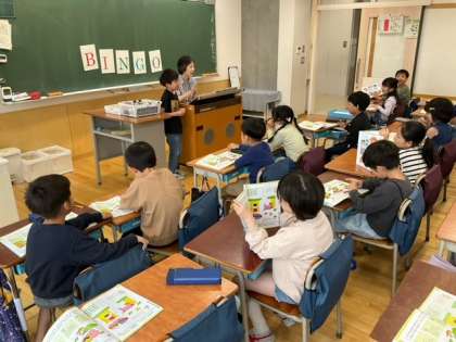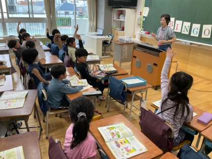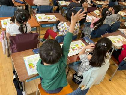 音楽の時間です。「かくれんぼ」かけ合いながら、楽しく元気に歌っています。「じゃんけん、ぽん」