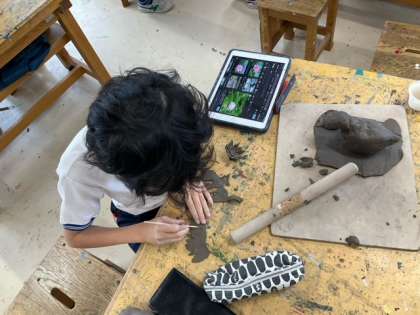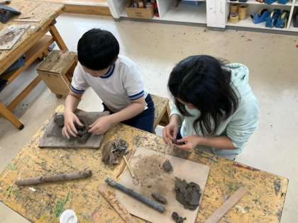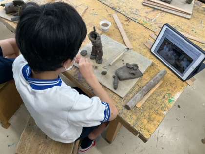 図工の時間です。「ぺたんこねん土でつくってみると」6年生になると、さすがの難易度です。