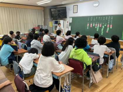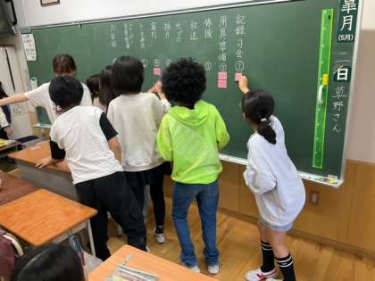 学級活動の時間です。運動会の担当や係を決めています。みんなの力で、最高の運動会にしましょう!