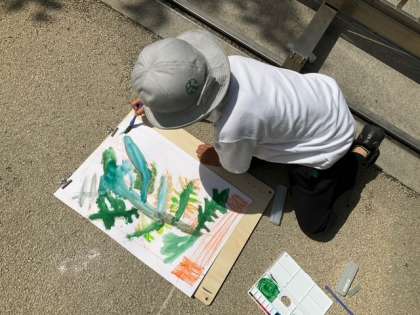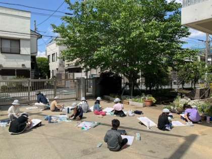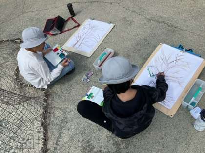 図工の時間です。「木々を見つめて」校庭に出て、お気に入りの木を見つけました。