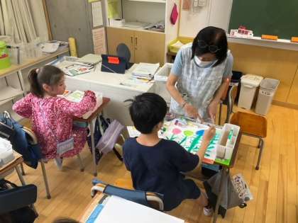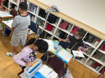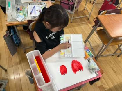 図工の時間です。「すてきな色で すてきな花を」絵の具と水のハーモニーを楽しんでいます。