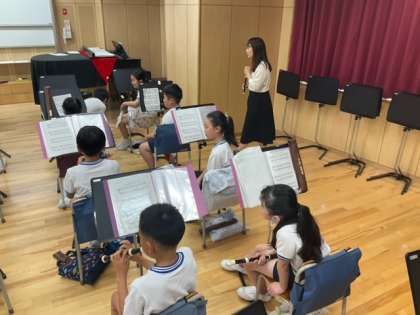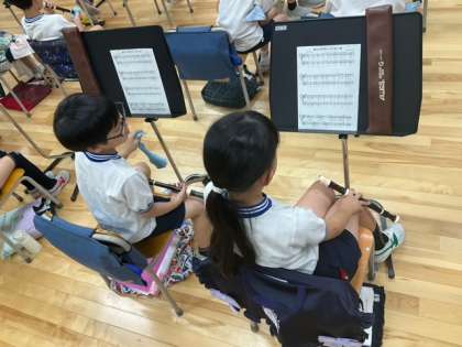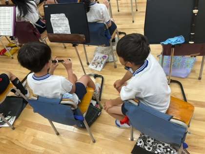 音楽の時間です。リコーダーの響きをお互いに聞き合って、アドバイスしています。