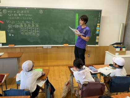 算数の時間です。「ゼリーが20こあります。5人で同じ数ずつ分けると、1人分は何こになりますか。」