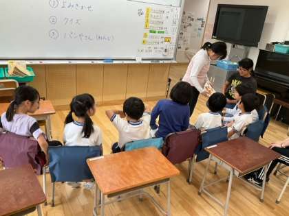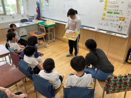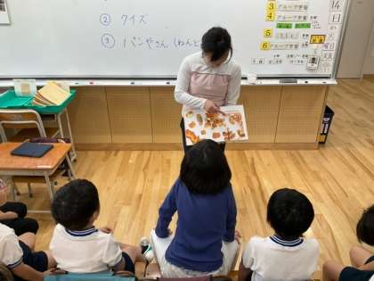 グループ学習の時間です。先生が読み聞かせをしてくれています。美味しそうなパンのお話です。