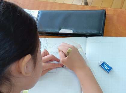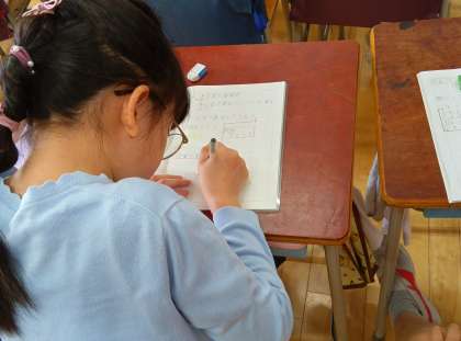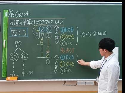 算数の時間です。わり算のひっ算の仕方を考えました。一つ一つ意味を考えながら、問題を解きました。