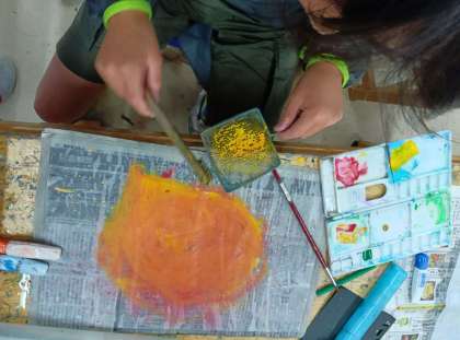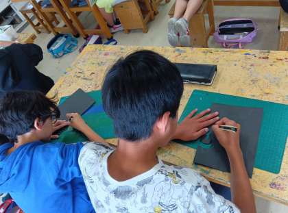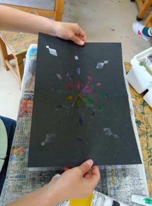 図工の時間です。障子紙に色を付けて、カッターを使って模様を作った黒い紙を合わせると。
