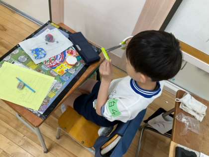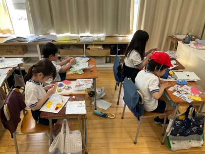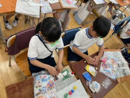図工の時間です。「くっつきマスコット」形を作って、飾りをして、磁石をつけたら完成ですね。