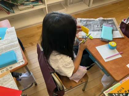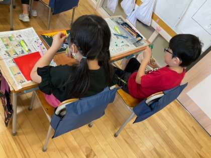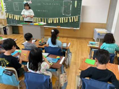 図工の時間です。「ちょっきんぱって かざろう」折り紙を折って、ハサミを入れると、すてきな飾りの出来上がりです。