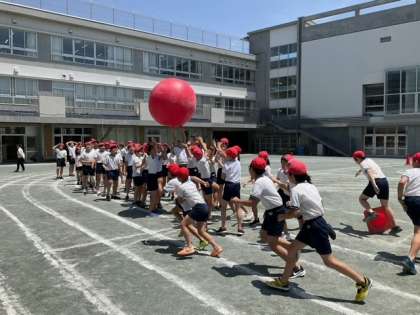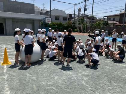 学年練習の時間です。6年生の団体競技は、新種目です。これが、なかなか難しい!