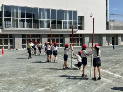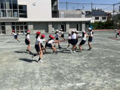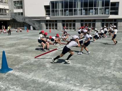 学年練習の時間です。5年生の団体競技は、「棒引き」です。作戦が大事ですね。