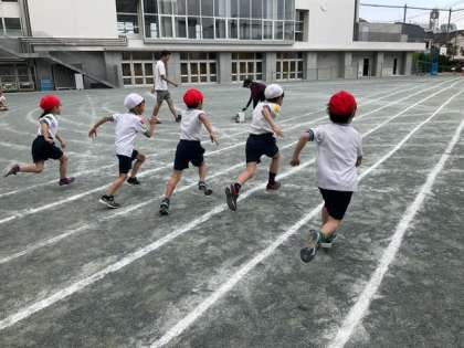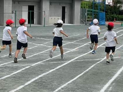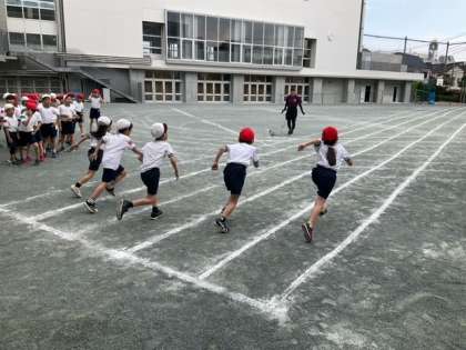 学年練習の時間です。短距離走の練習をしています。全力でゴールまで走り切りましょう。