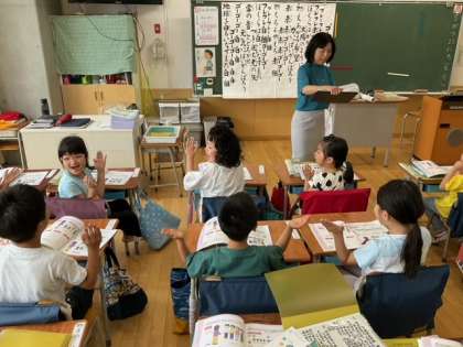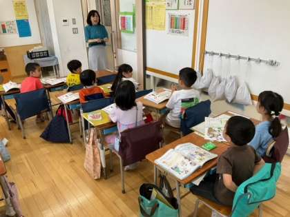 音楽の時間です。先生の呼びかけに、返事と手拍子でこたえています。