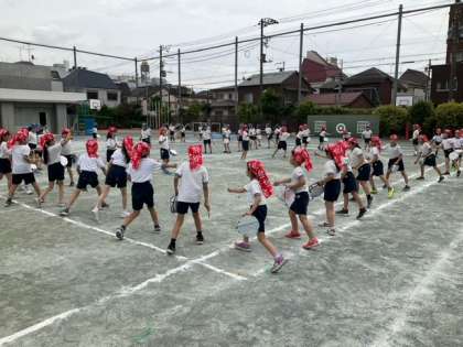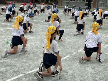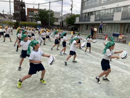 学年練習の時間です。クラスカラーのサージをかぶり、太鼓を叩きながら踊ります。