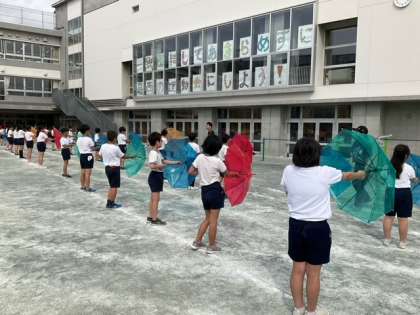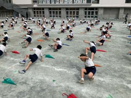 学年練習の時間です。「きみの夢は ぼくの夢」鮮やかな傘の演技に、思わず引き込まれていきます。