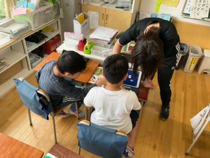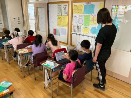 理科の時間です。春をテーマに観察カードに記録しています。それぞれがお気に入りの写真をカードに貼り付けています。