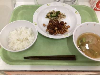 ごはん カツオと大豆のみそがらめ もやしとわかめの和物 新玉ねぎの味噌汁 牛乳