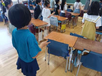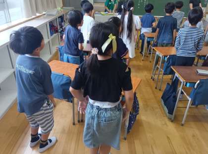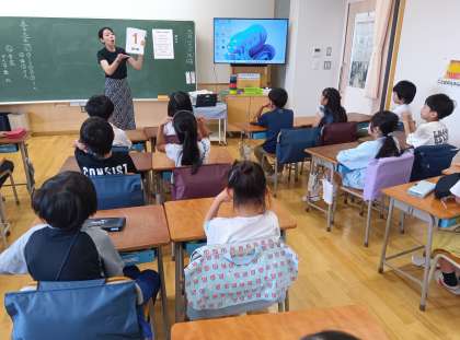 外国語の時間です。数の言い方を英語で練習しました。ALTの先生の発音をよく聞いて真似していました。