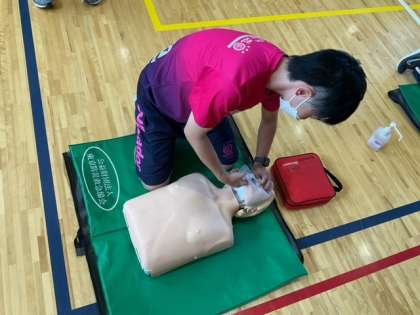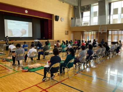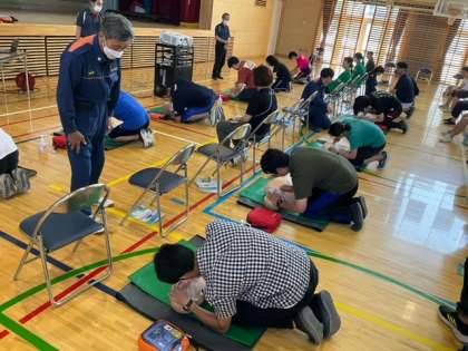 水泳シーズンを控え、教職員が救急救命講習を受けています。安全な水泳指導のためにしっかりと準備を進めています。