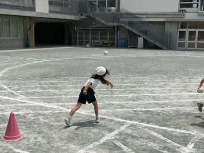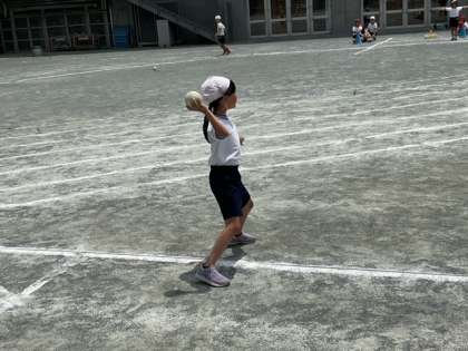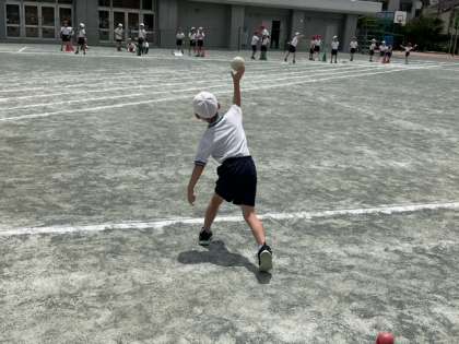 体育の時間です。校庭をいっぱいに使って、ソフトボール投げの練習をしています。