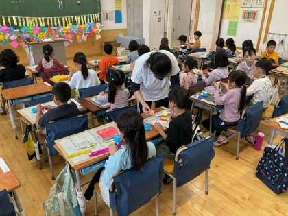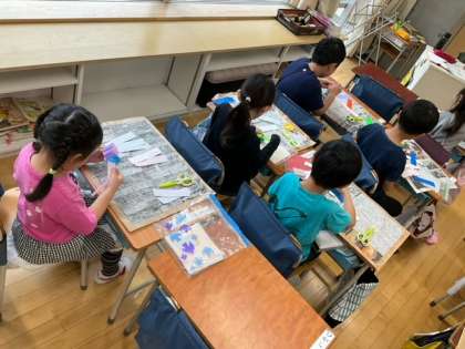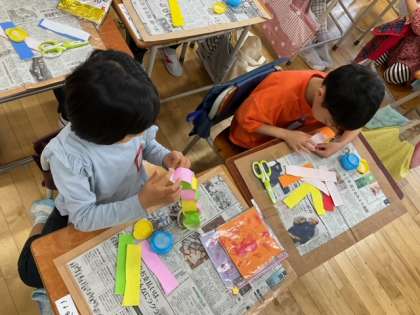図工の時間です。折り紙を使って、飾りづくりに取り組んでいます。輪飾り作成中です。