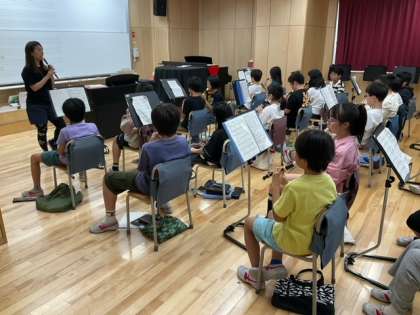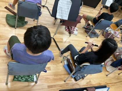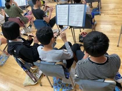 音楽の時間です。カントリーロードを演奏しています。リコーダーの音色がきれいに響いています。