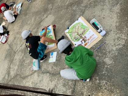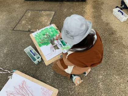 図工の時間です。「木々を見つめて」月曜日はずっと雨でしたね。久しぶりに外に出ることができました。
