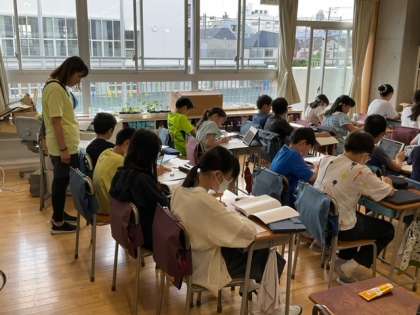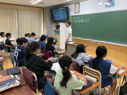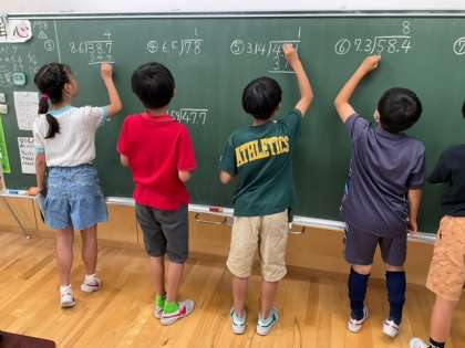 算数の時間です。小数のわり算の学習をしています。小数点の付け方に注意して計算しましょう。