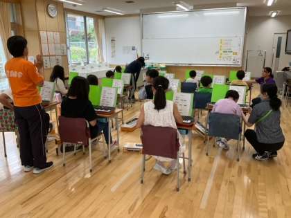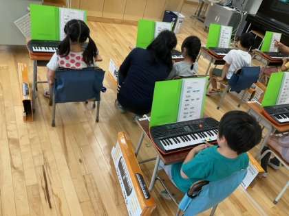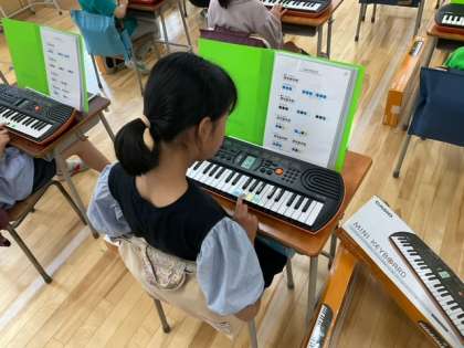 音楽の時間です。ミニキーボードの練習をしています。楽譜をよく見て、一音一音ていねいに音を出しています。