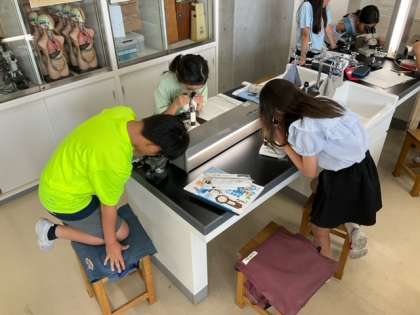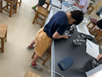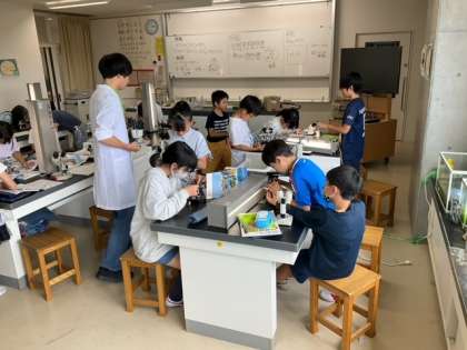 理科の時間です。メダカの卵の観察をしています。たくさん観察して、顕微鏡の使い方に慣れましょう。