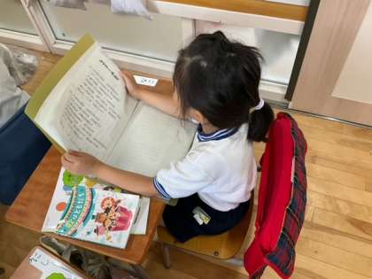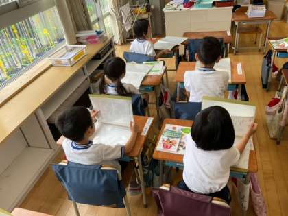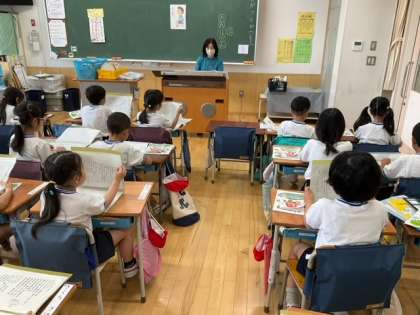 音楽の時間です。「レッツゴー! あしたへ」を元気よく歌っています。みんなで声を合わせて、「レッツゴー!」