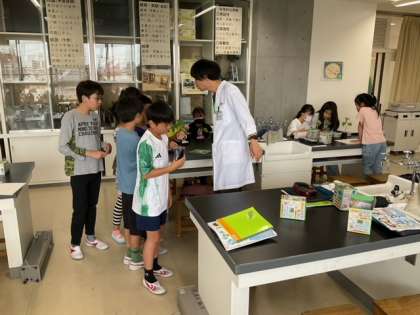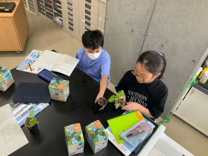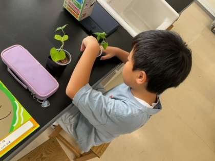 理科の時間です。「種の発芽と成長」植物が成長するためには、どのような条件が必要なのか、インゲン豆で実験しています。ー
