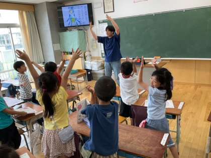 日本語の時間です。先生の言葉の指示を聞いて、体を使って表現しています。