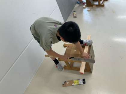 図工の時間です。「トントンつないで」角材とうすい板を釘でつないで、動くものを作っています。